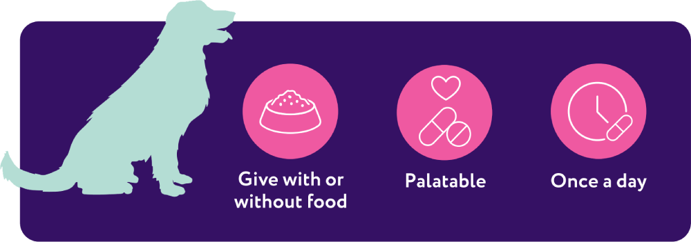 To be given once a day, with or without food. Suitable for dogs of all breeds and sizes. Always make sure fresh drinking water is available
